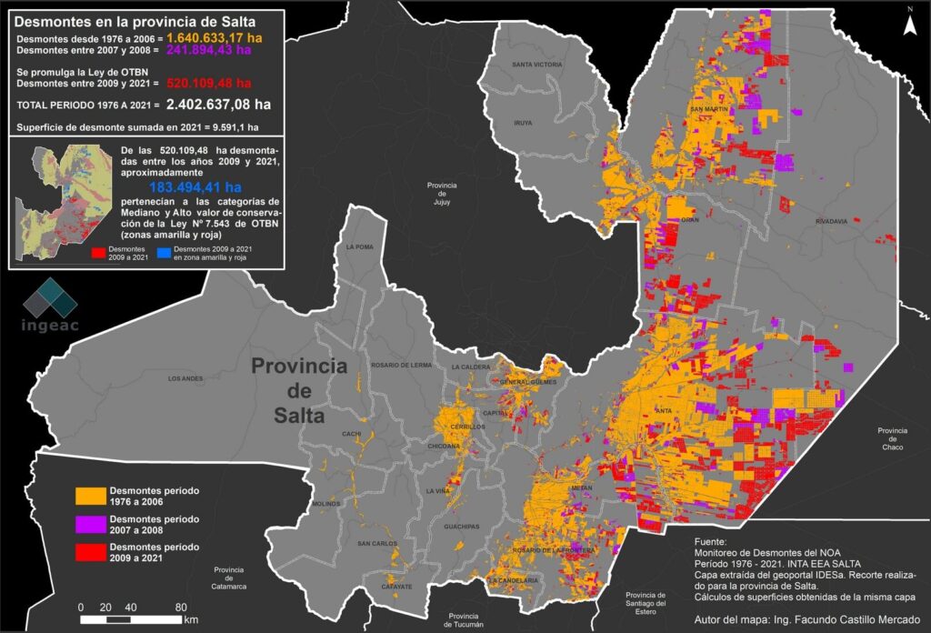 El mapa original, analizaba la situación de la provincia de Salta en el período 1976 – 2019, A partir de este se realizaron dos actualizaciones, siendo a última la que incorpora datos de desmontes del año 2021.